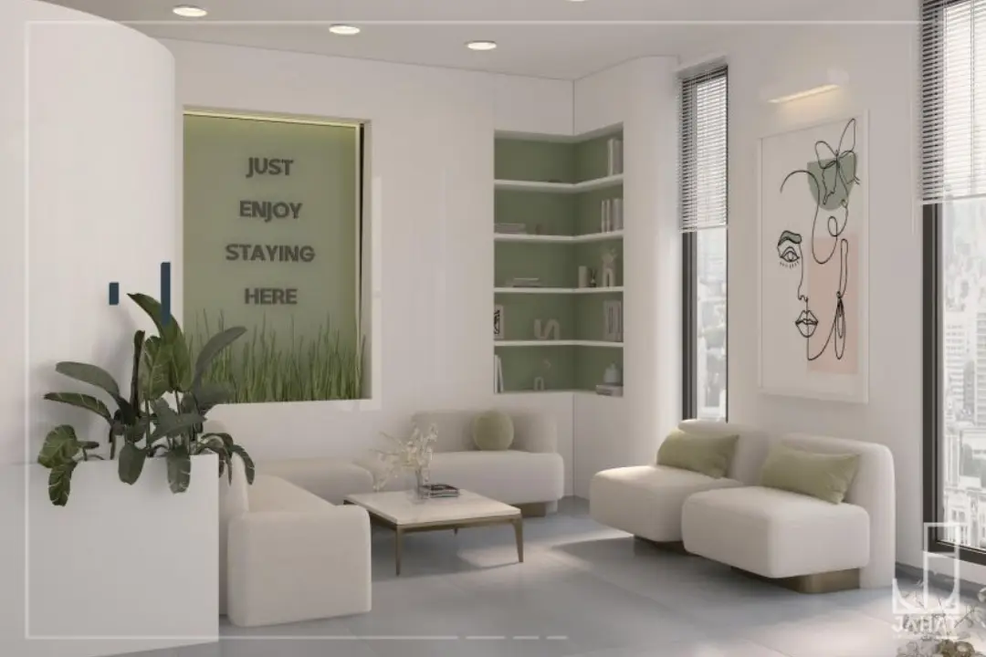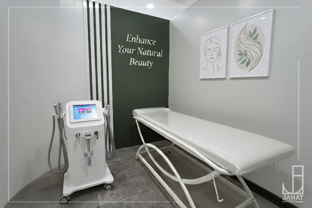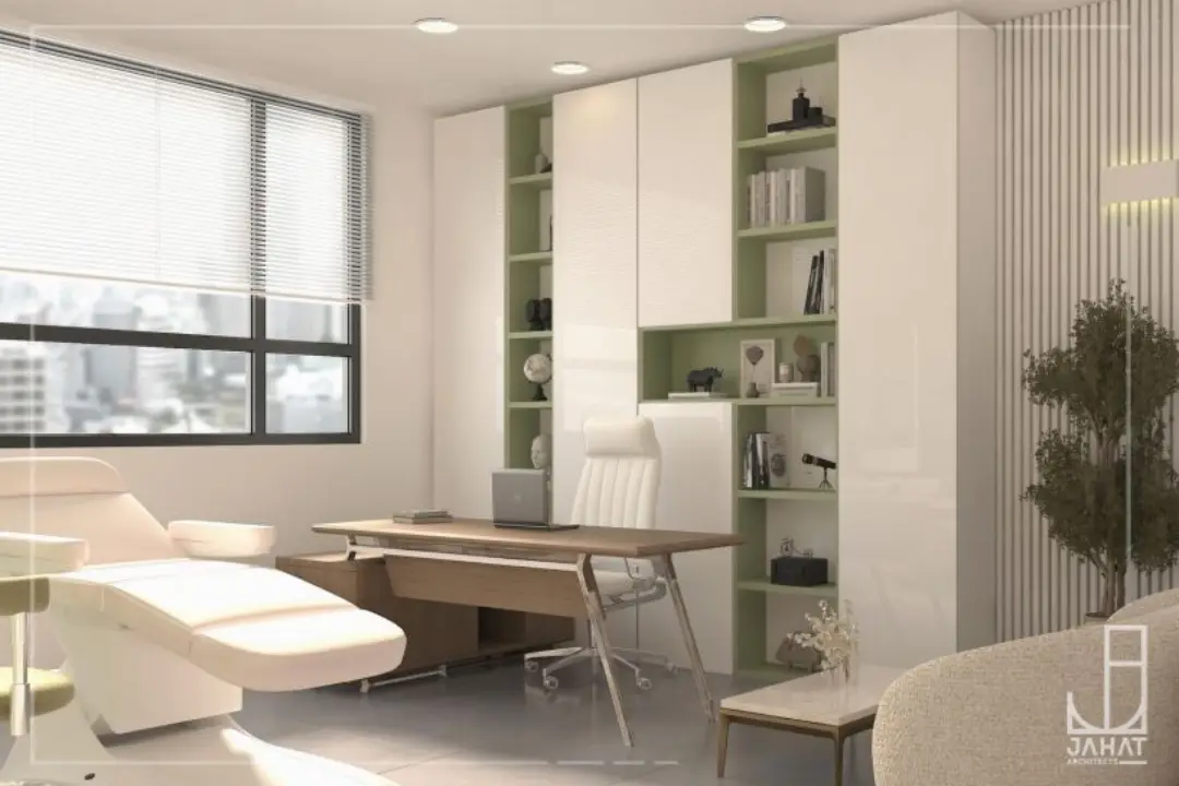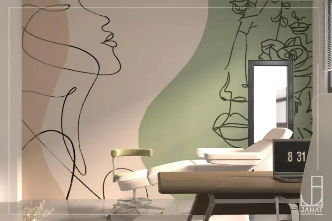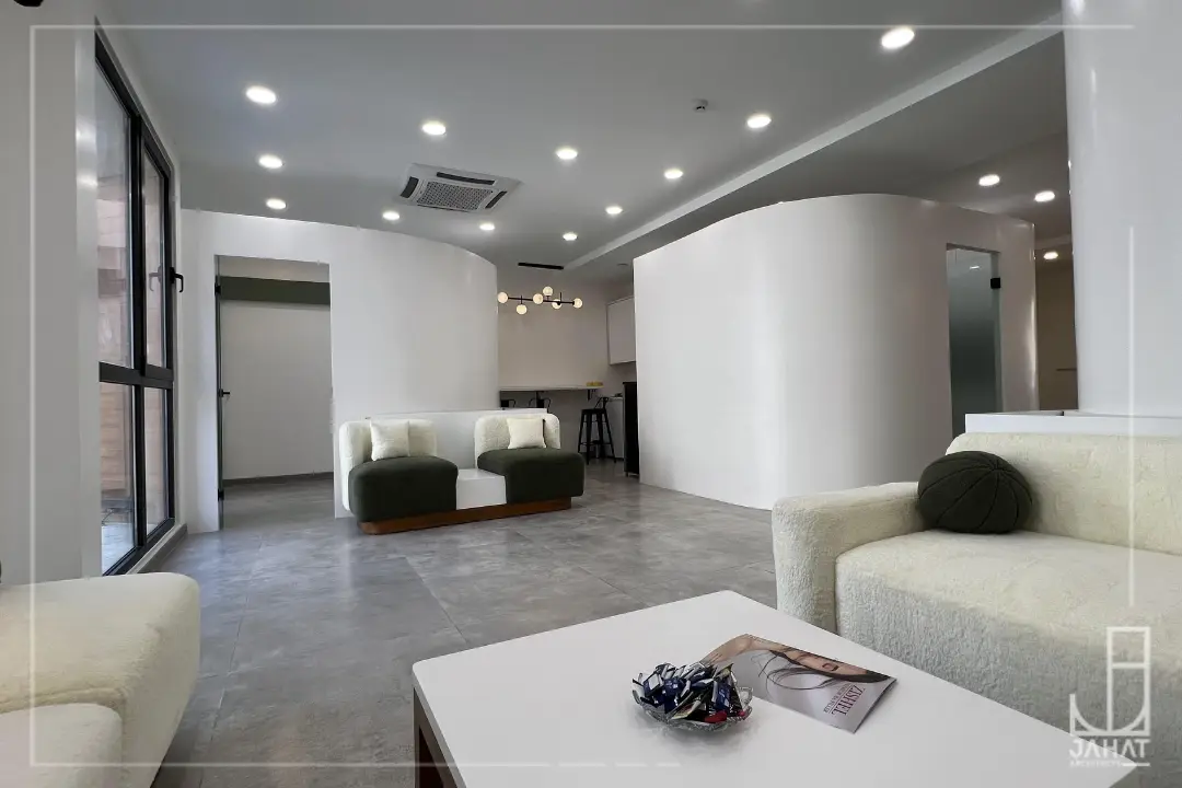 از آنجایی که این پروژه کاربری کلینیک زیبایی داشت و قرار بود بانوان از این محیط استفاده کنند، ترجیح داده شد در طراحی و اجرای دکوراسیون مطب از فرم‌‎های نرم‌تر برای دیوارها استفاده شود و به دلیل اهمیت تعداد فضاها، به ویژه برای کارفرما، با استفاده از کناف، جداسازی فضا صورت گرفت.